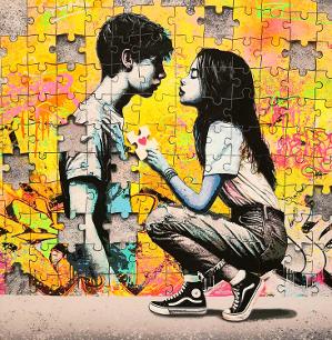 Tittel: "Kiss B" Størrelse: B:50 x H:50 Teknikk: D.G.A. I tillegg til prisen kommer 5% i kunstavgift.